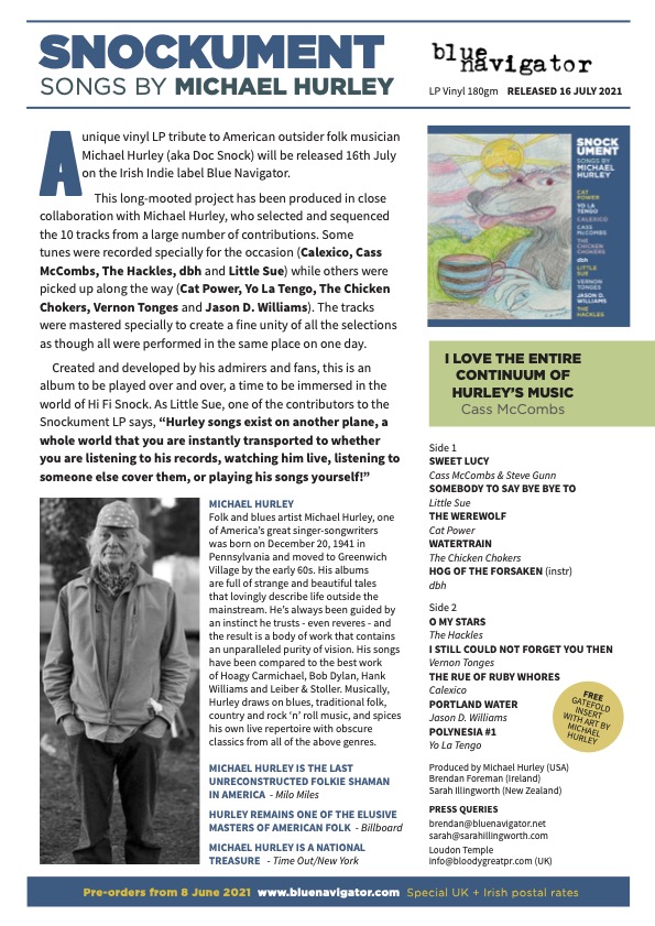 Snockument: Songs By Michael Hurley is available on limited edition Vinyl LP. An alternate version is available on CD and online. For more or to purchase, visit bluenavigator.com.